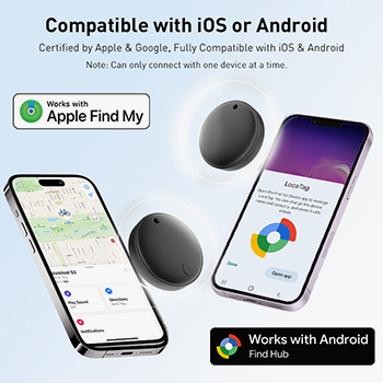 It connects via Apple Find My or Google Find My Device networks for effortless global tracking - no GPS or Wi-Fi required.